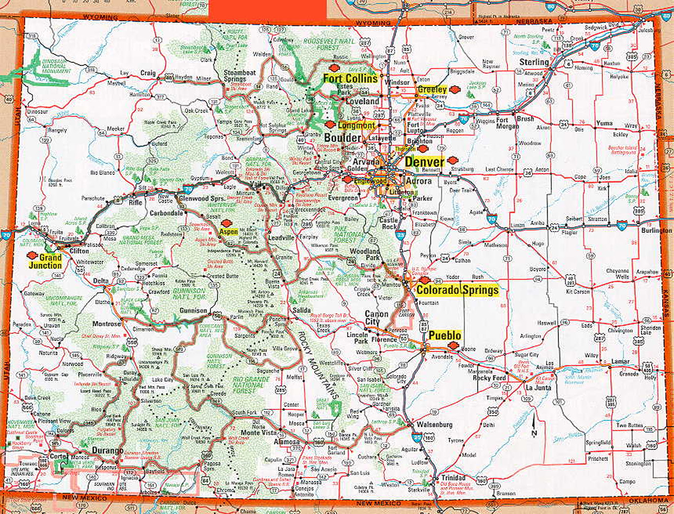 map of Colorado cities (Ian Hill) Colorado is bordered by Wyoming to the north, Nebraska by the northeast, Kansas to the east. This map shows cities, towns, highways, roads, rivers, lakes, national parks, national forests, state parks and monuments in Colorado. Here are free printable Colorado maps for your personal use.