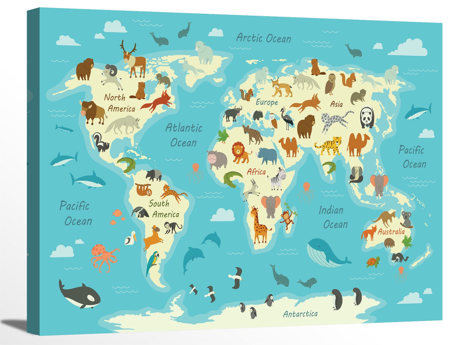 Cartoon Animal World Map For Kids Block Giant Wall Art Poster
